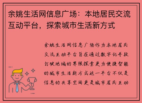 余姚生活网信息广场:本地居民交流互动平台,探索城市生活新方式