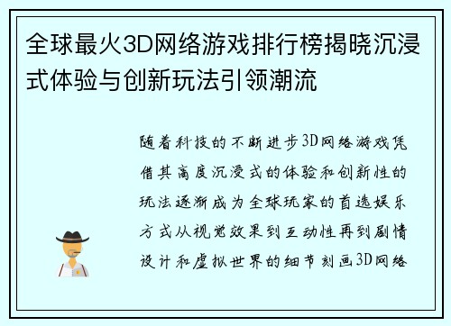 全球最火3D网络游戏排行榜揭晓沉浸式体验与创新玩法引领潮流