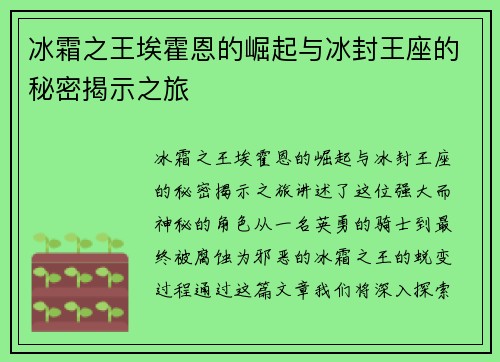 冰霜之王埃霍恩的崛起与冰封王座的秘密揭示之旅